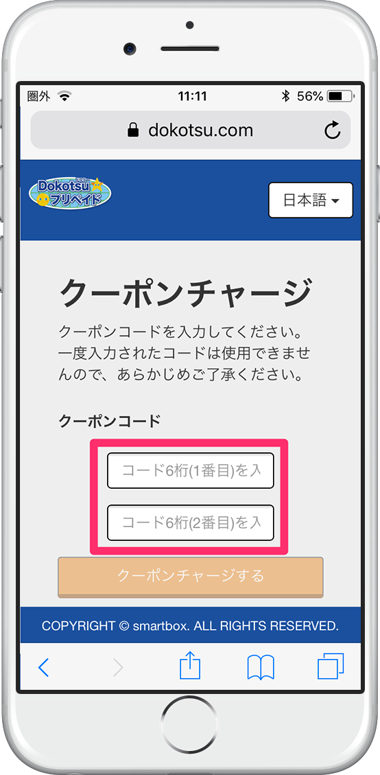 10.お手持ちのクーポンコードを6桁に分けて上下にご入力ください。