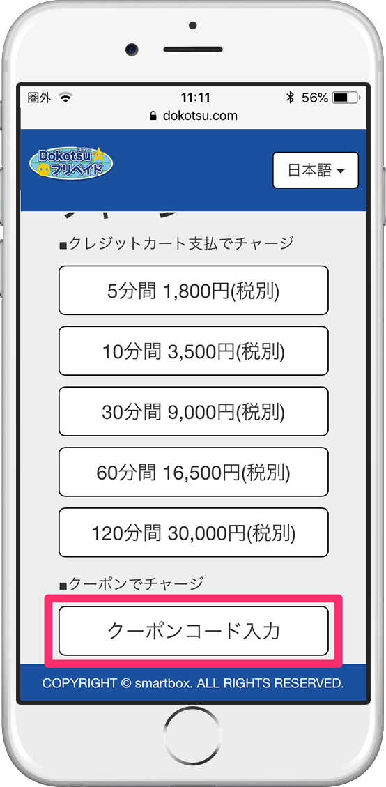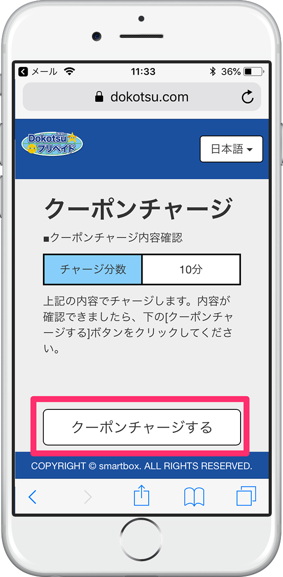 11.チャージ分数をご確認いただき、「クーポンチャージする」をタップしていただくとチャージが完了します。