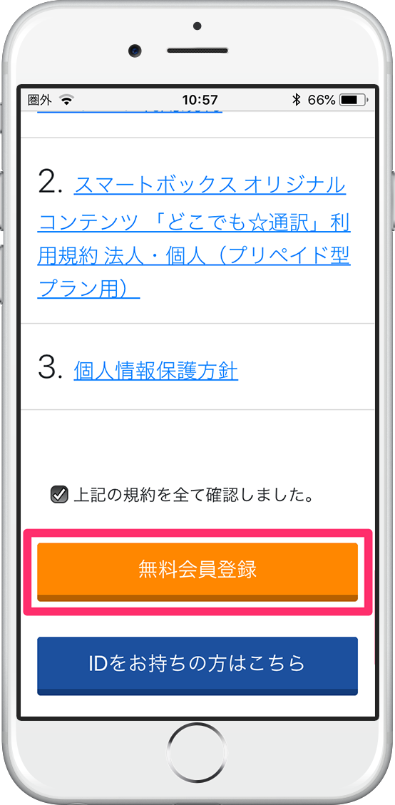 2.利用規約を一読いただきチェックボックスにチェックを入れて無料会員登録ボタンをタップしてください。