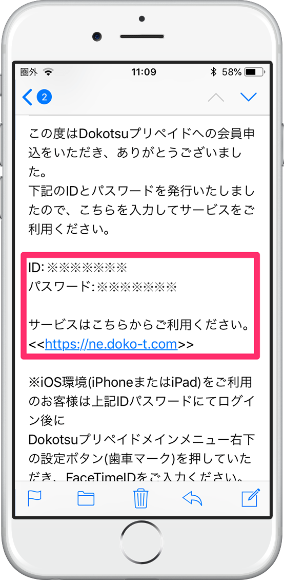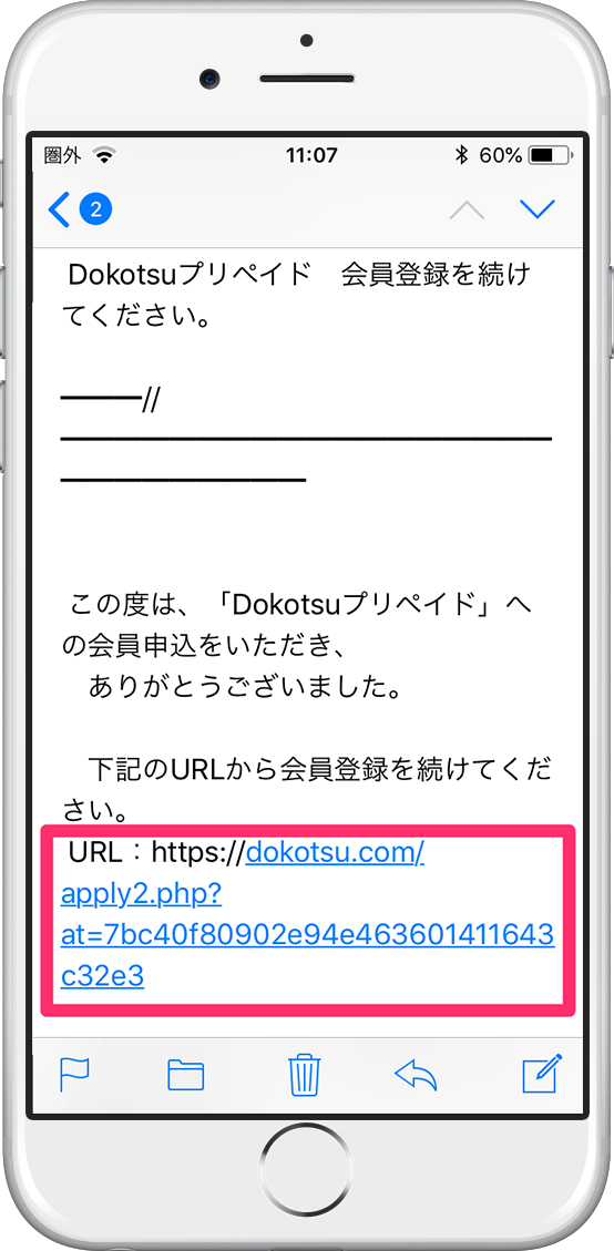 4.送信いただいた端末宛にDokotsuプリペイドより自動返信メールが届きます。メール本文に会員登録を行うURLがございますのでタップしてください。