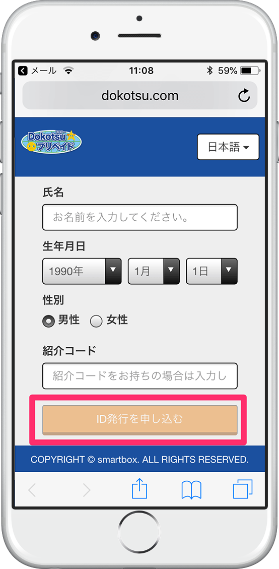 5.ID発行手続きより氏名・生年月日・性別を入力していただき、「ID発行を申し込む」をタップしてください。