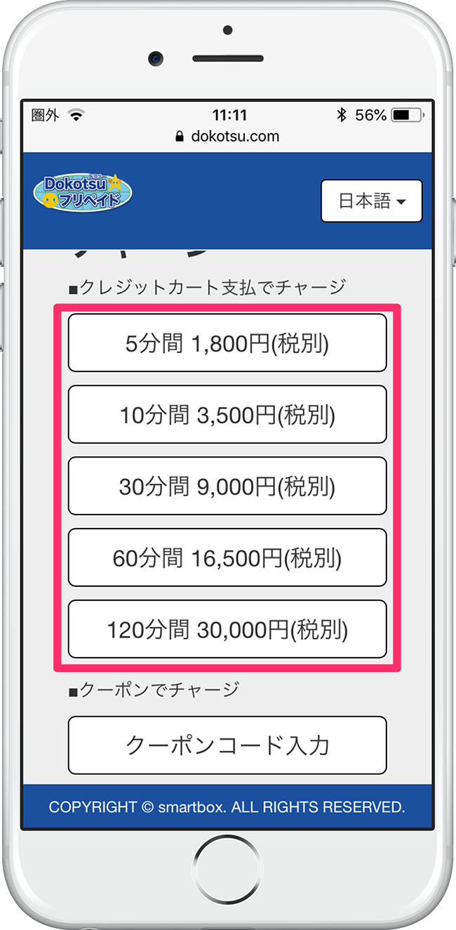 9.チャージ画面のチャージしたい分数をタップしてください。