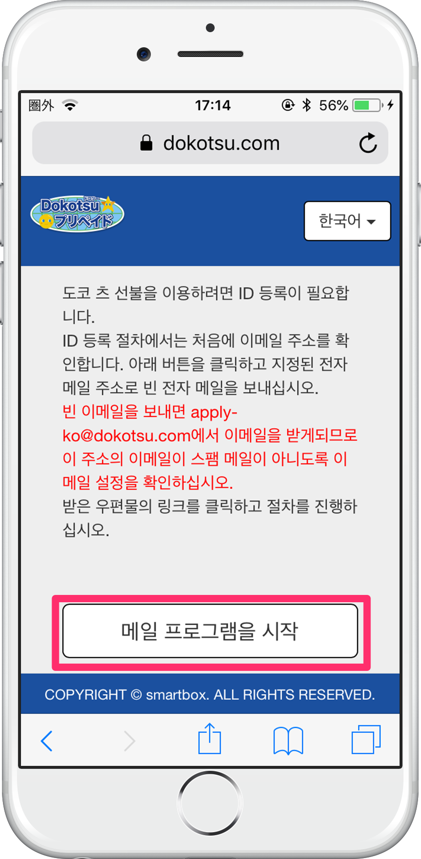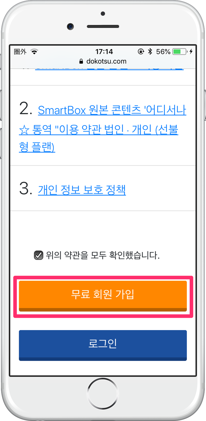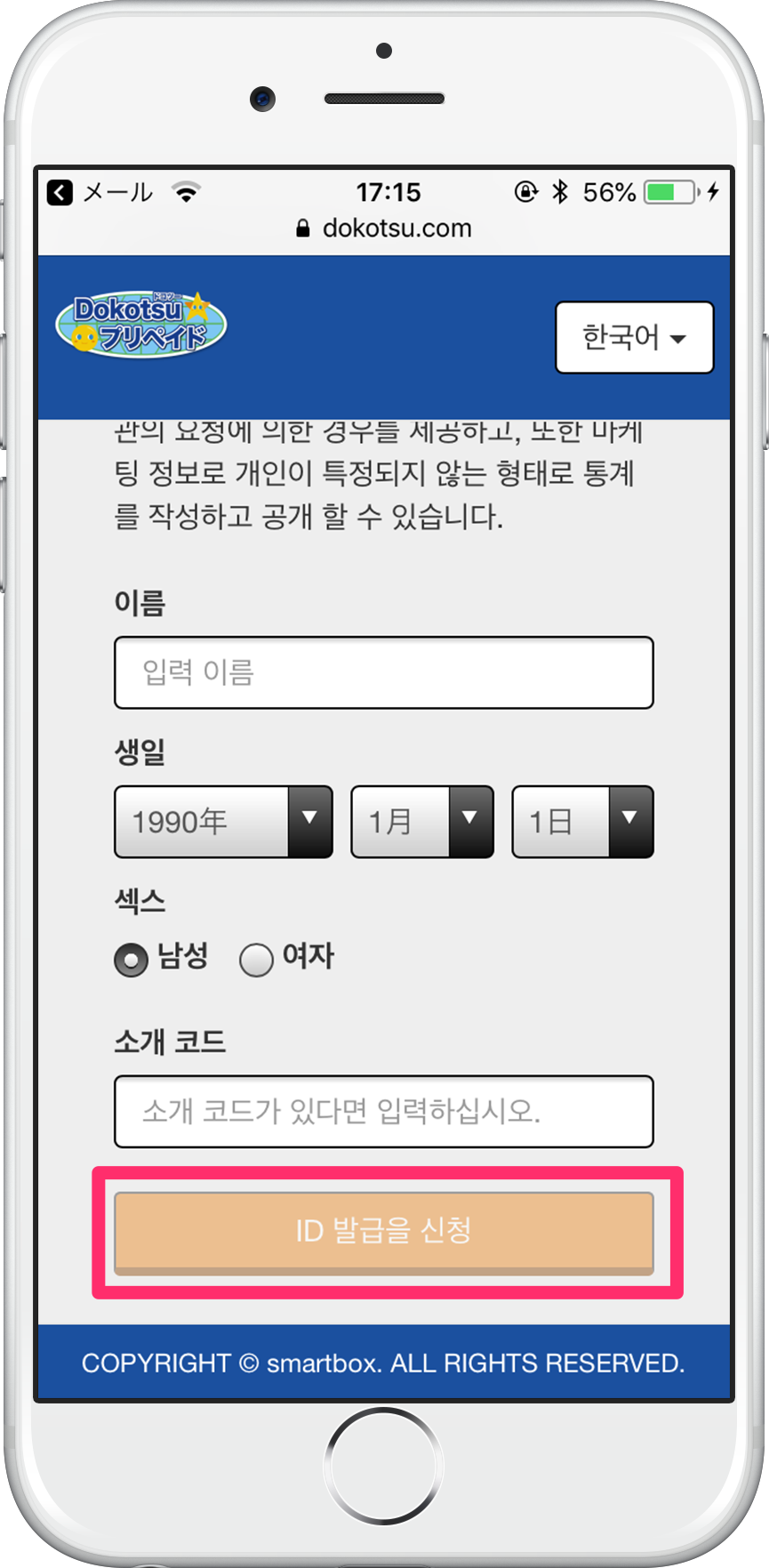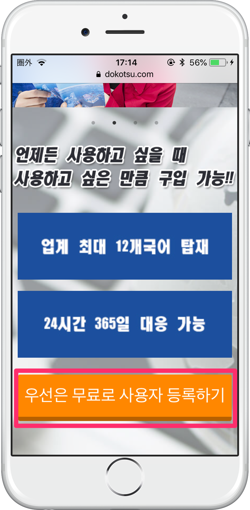 1.Dokotsu 프리페이드의 무료 회원 등록 버튼을 클릭해 주세요.