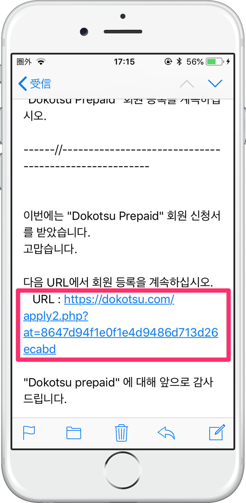 4.송신하신 단말기로 Dokotsu 프리페이드로부터 자동 회신 메일이 발송됩니다. 메일 본문에 회원 등록을 하실 수 있는 URL이 있으므로 클릭해 주세요.